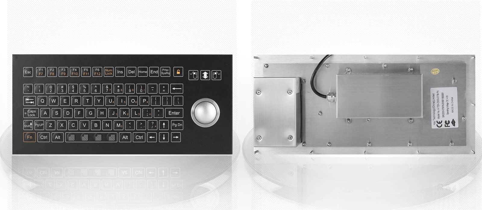 DESCRIPTION: 81 keys compact format IP65 dynamic rated industrial membrane keyboard with function keys on the upper line & integrated IP68 dynamic rated washable 38.0mm optical trackball module with 800 DPI resolutions for fast and accurate cursor position, industrial PCB OMRON switch technology with short stroke 0.45mm with extremely good tactile feeling for reliable data input, with FN+LOCK key for easy cleaning via lock/disable the entire keyboard without needing to take away the keyboard from PC, surface mounted extremely flush with anti-microbial, durable and scratch-proof polyester withstand to most chemicals and liquids under the harshest environments, the durable fonts printed on the film underneath never fade, ruggedized stainless steel back plate with brushed treatment, top panel mounted solution with threaded bolts.